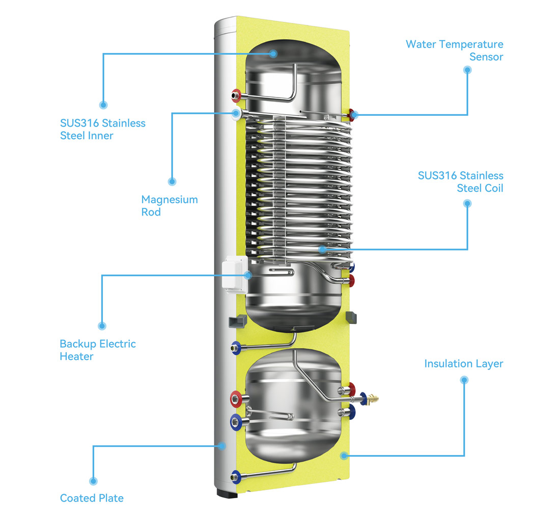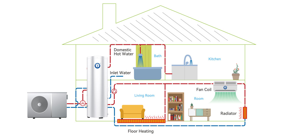 Zestaw pompa ciepła powietrze-woda z serii Flamingo + zbiornik kombinowany: CWU 250L (w tym zbiornik buforowy 100 L).